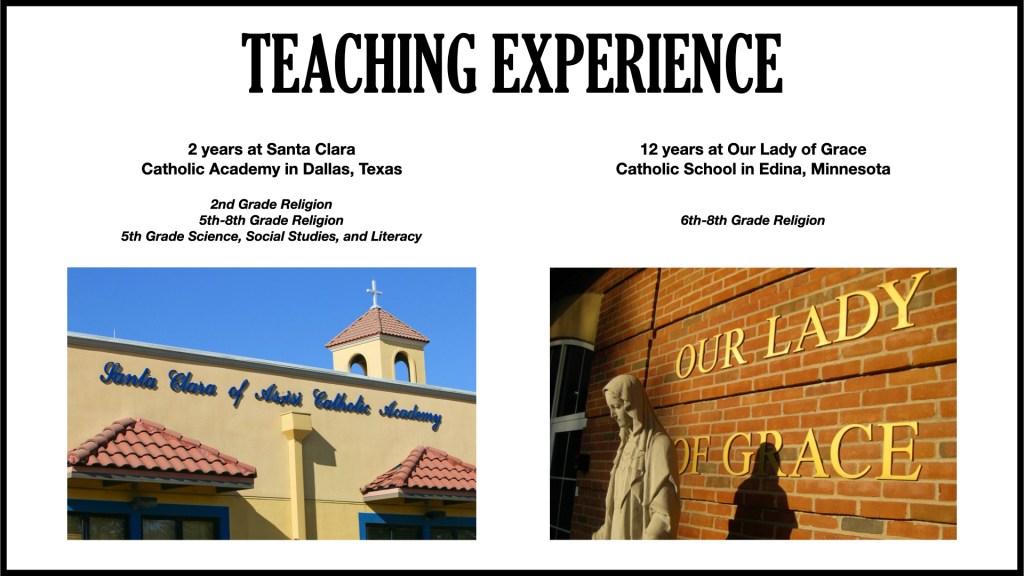 - Taught religion for 2 years in Texas and 12 years in Minnesota. 👨🏫