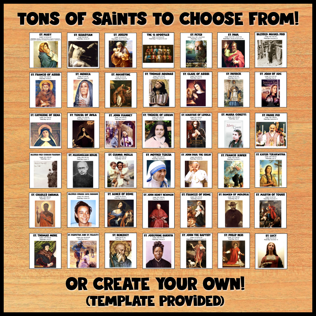 Bring the saints to your students every day of the year with these ready-to-go saint cards! With 42 saintly all-stars to choose from (and a template for you to create more saint cards if you’d like), you’ll be fully ready to introduce your students to some of the best and most loved saints of the Catholic Church!