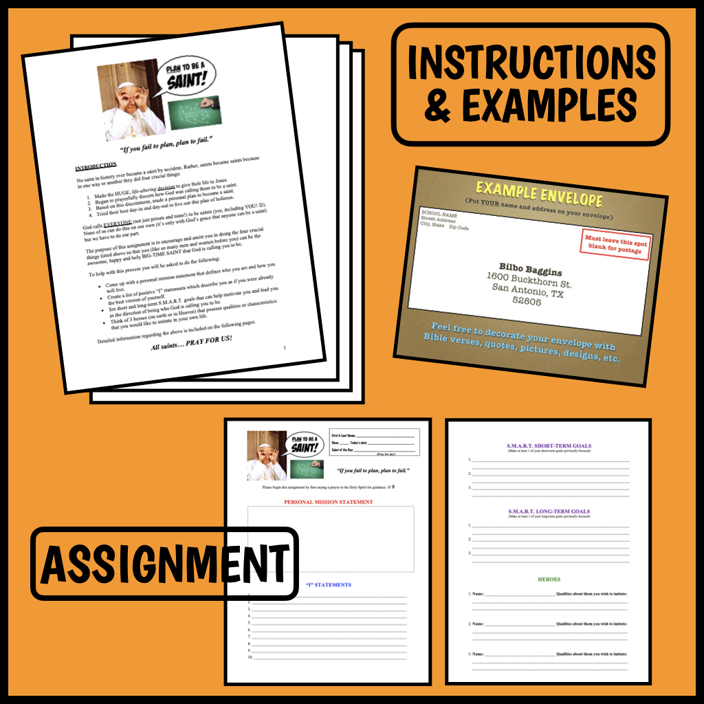 Inspired by a holy friend and mentor of mine, Plan to Be a Saint is designed to help your students prayerfully discern the kind of saint God is calling them to be and then create a vision for how they can work towards a life of true holiness and purpose. Not only is this an assignment that students really enjoy, but it has the possibility of being incredibly life-changing for them as well!