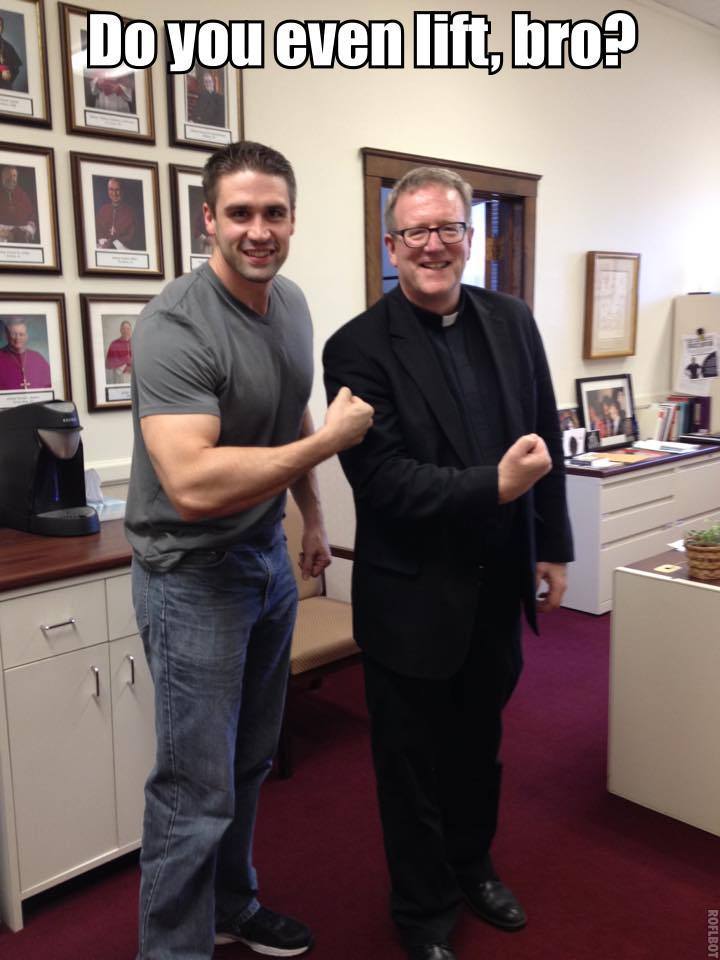 Back in 2013 the Archdiocese of St. Paul-Minneapolis had a big event called “Catholic Celebration”. Bishop Barron was invited to be the keynote speaker and, as someone with a personal connection to Bishop Barron (he was my professor of Political and Social Philosophy while I was discerning the priesthood at Mundelein Seminary way back in ’04-’05) I was asked to help track down Bishop Barron at the airport so he could hop in the getaway car and get right to the event (Bishop Barron’s flight was delayed and he almost missed his keynote presentation!). To help Bishop Barron find me I told him I would be wearing a giant foam cowboy hat (instead of holding a sign like most people do). Well, the cowboy hat definitely worked as Bishop Barron spotted me right away and responded with a huge smile and a hearty chuckle. 😀