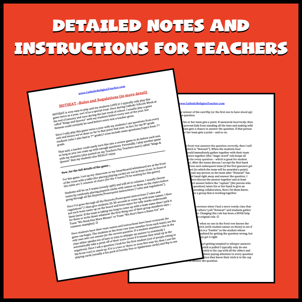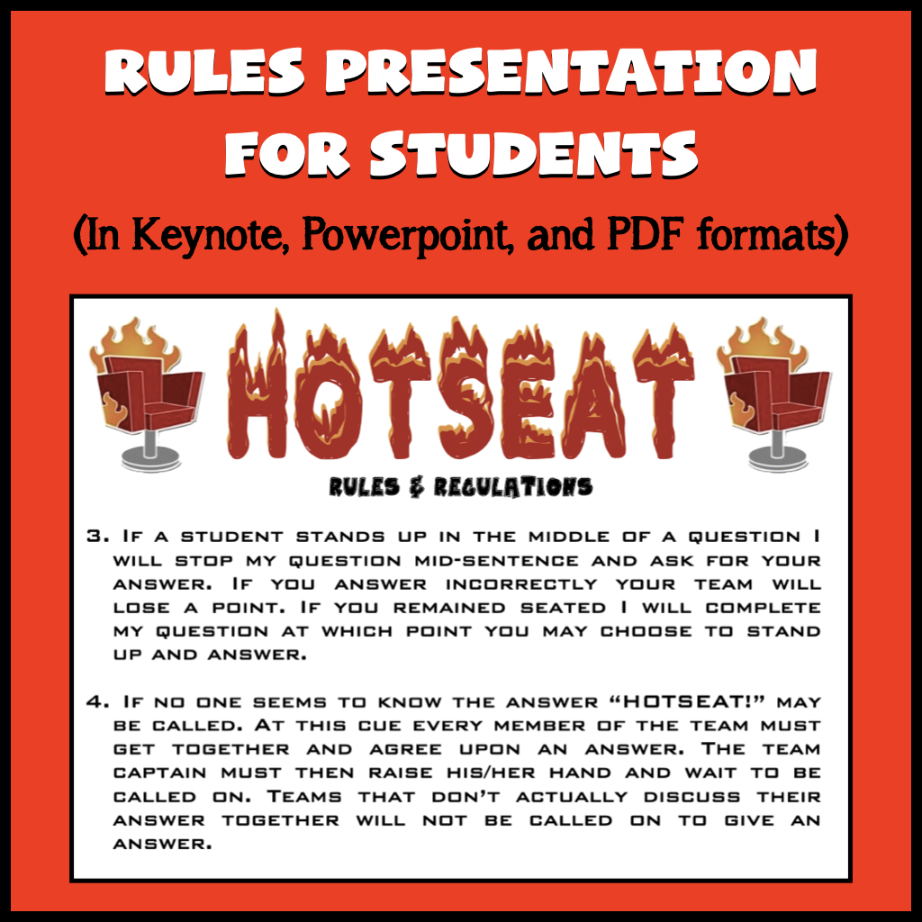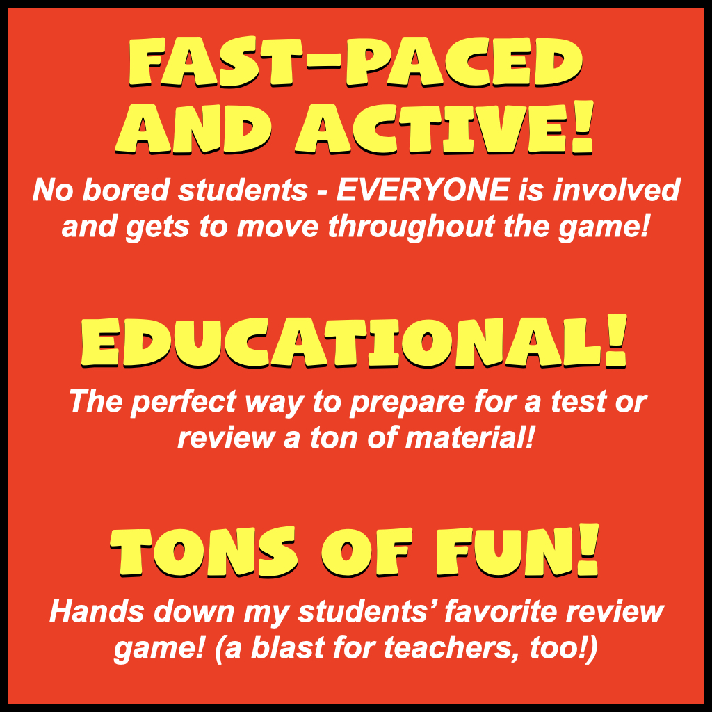 HOTSEAT is an extremely fun and engaging game for you and your students to play either when preparing for a test or simply wanting to do something fun yet based off of what you’ve been learning this year. The game involves teams, rapid fire questions, and tons of (structured) student movement (which the kids, of course, really appreciate). Hands down my students’ favorite review game!