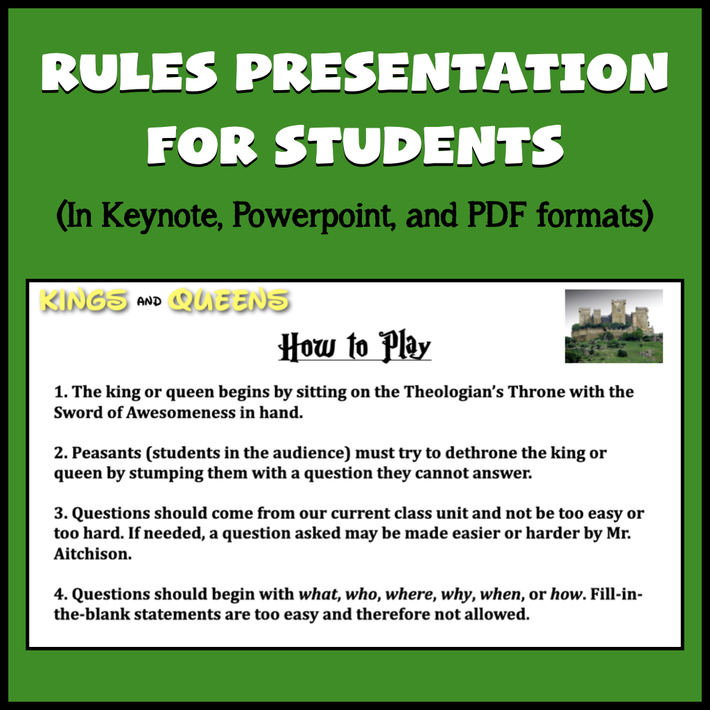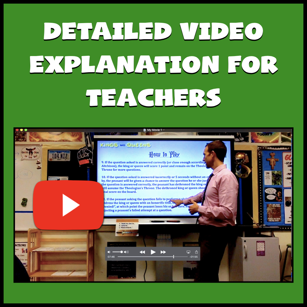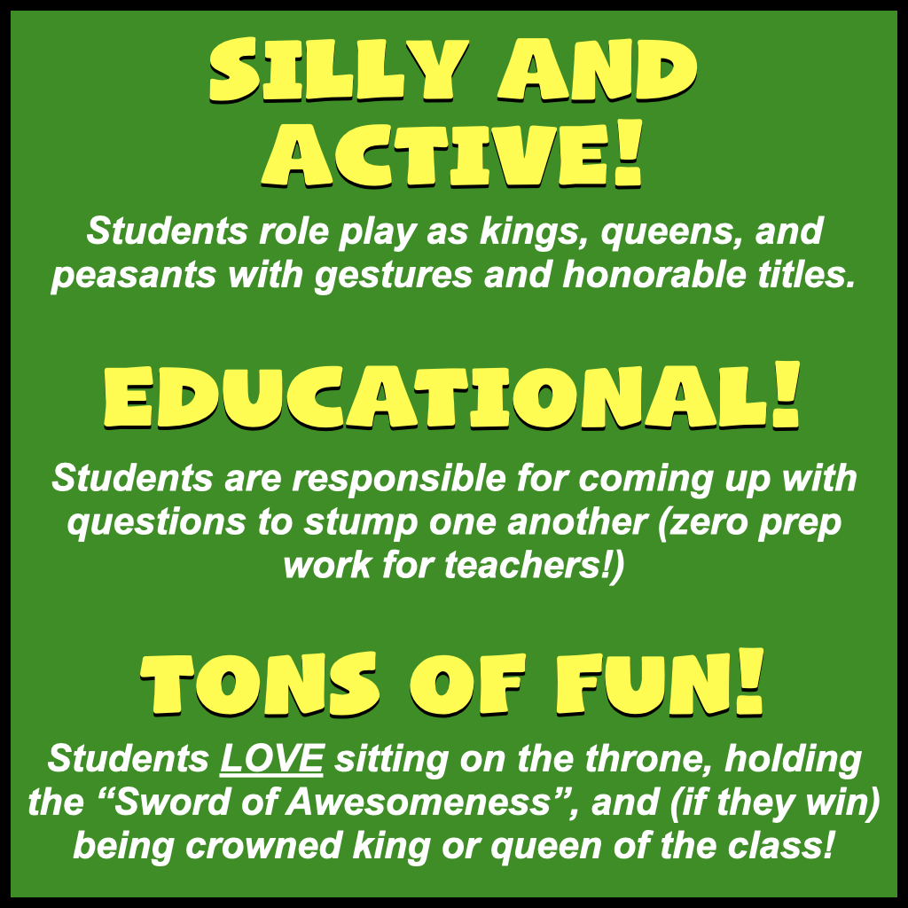 Kings & Queens is an extremely fun game that’s perfect for reviewing for a test. The game involves a throne, a “Sword of Awesomeness”, kings/queens, lowly peasants, and of course, tons of helpful review time for your students!