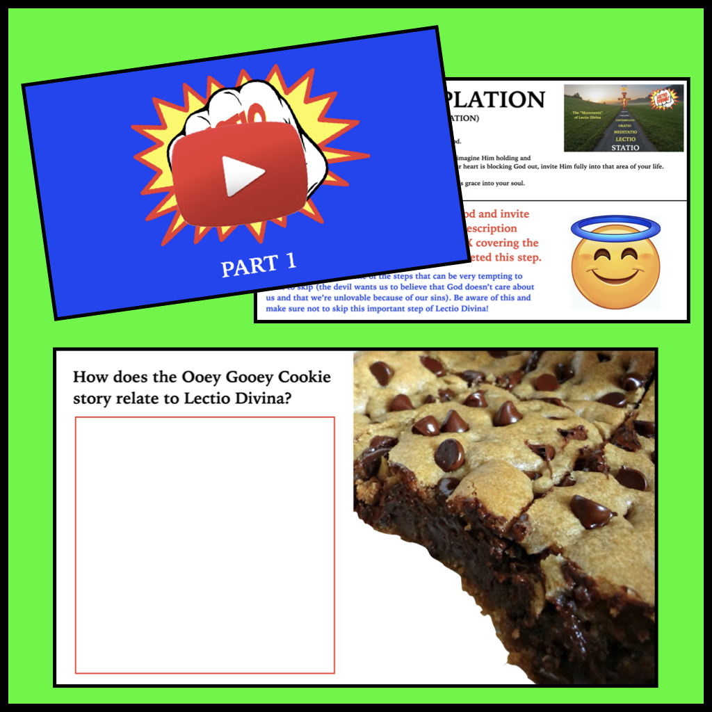 Using fun and unique ways to teach and explain Lectio Divina (including a story about an unforgettable ooey gooey chocolate chip cookie dessert!), this download comes fully loaded with 7 days worth of resources that can be used in a traditional class setting or for distance learning.
