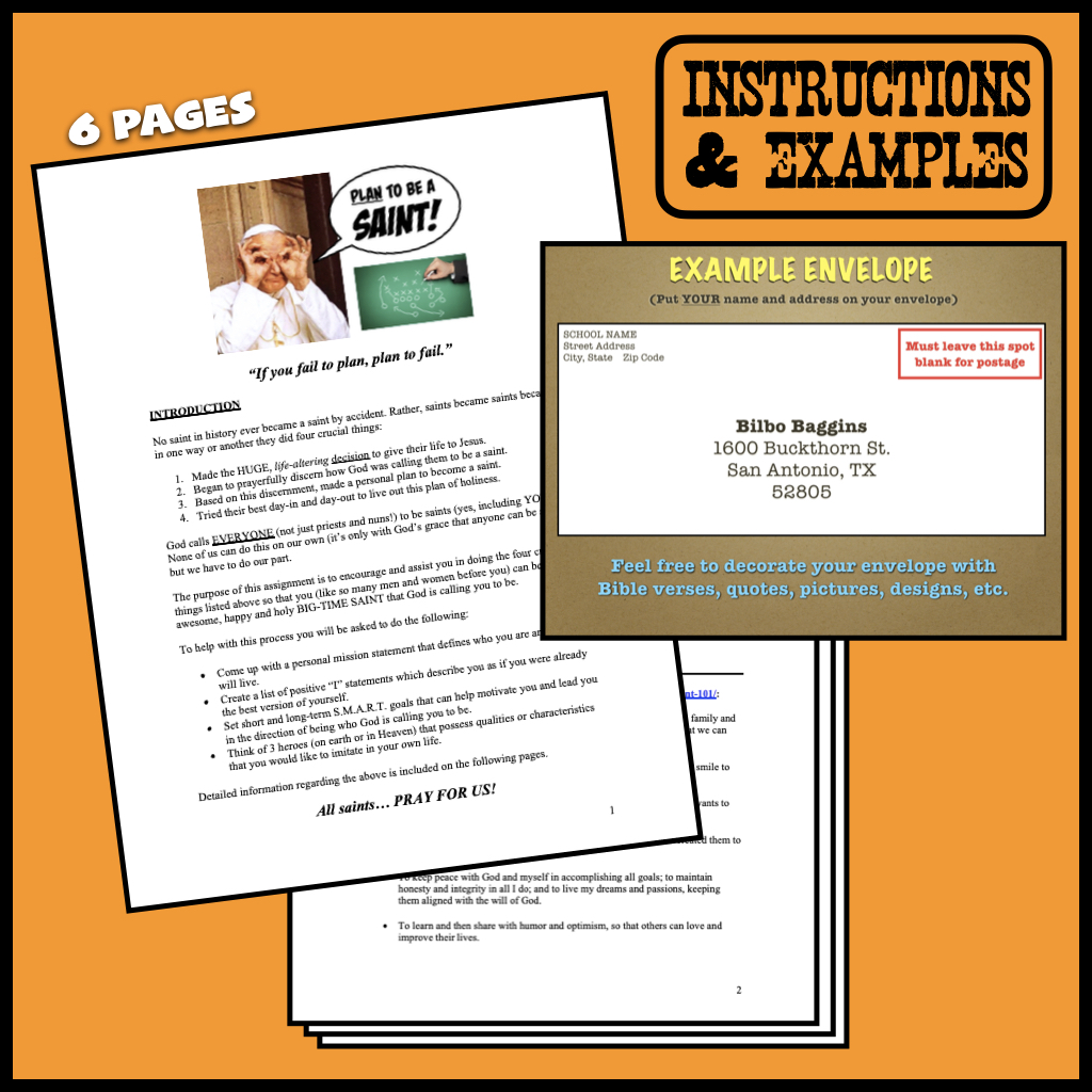 Stories and examples (along with 9 pages of extremely detailed, step-by-step notes on exactly what to do and say throughout this multiple-day lesson) will help you teach and explain the grand scope of this assignment. Plan to Be a Saint can be used in connection with New Year Resolutions, the season of Lent, the close of a school year, lessons on Jesus/saints/discipleship, or any time you want your students to pull back a bit to reflect on their lives and do something that will draw them closer to God and the saints He wants them to be.