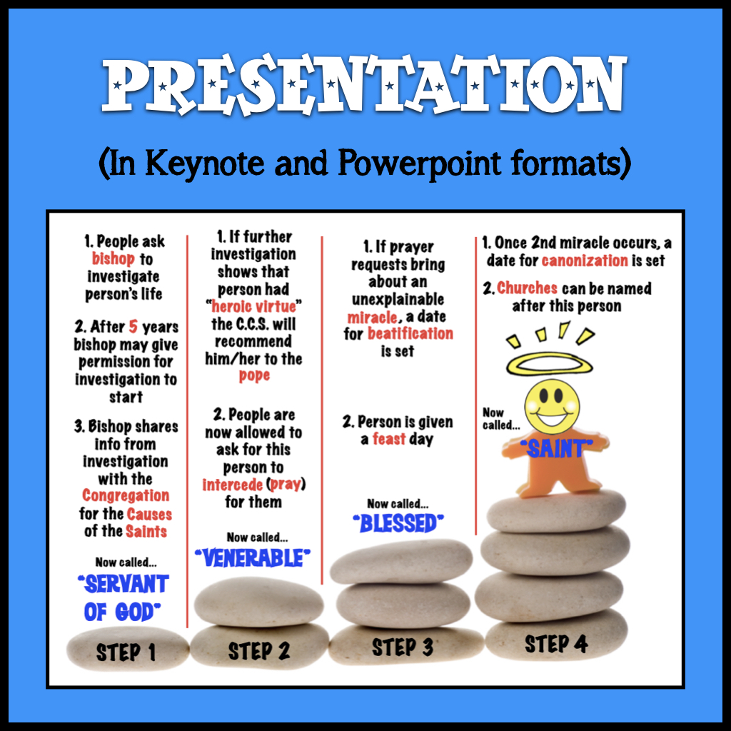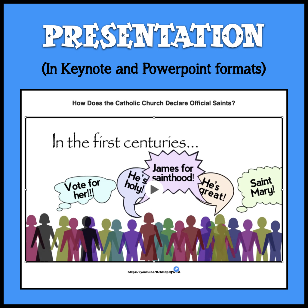 Enjoy this fun and visually attractive way to explain the process of how a person is declared a saint the Catholic Church. A full presentation with smooth transitions and builds so all you have to do is click and speak. Complete with guided notes for your students and capped off with a very fun and informative video from Busted Halo (already embedded in the presentation).