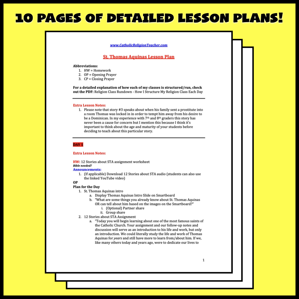 “This is an excellent resource! My students enjoyed listening to and reacting to the twelve anecdotes about St. Thomas that were presented in this lesson. The accompanying note sheet really helped reinforce the anecdotes and their lessons. The plan was easy to follow and provided additional insights not only on the saint himself but also ways to help the students connect to Thomas and the way he lived his life.”